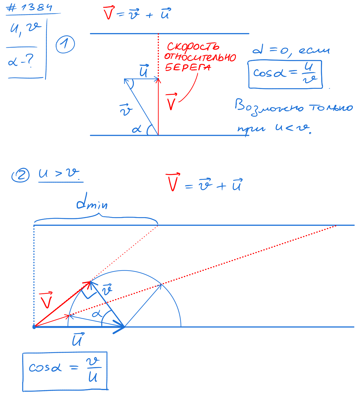 Скорость течения реки скорость катера относительно воды Под каким углом к берегу должен двигаться катер, чтобы пересечь реку по кратчайшему пути?