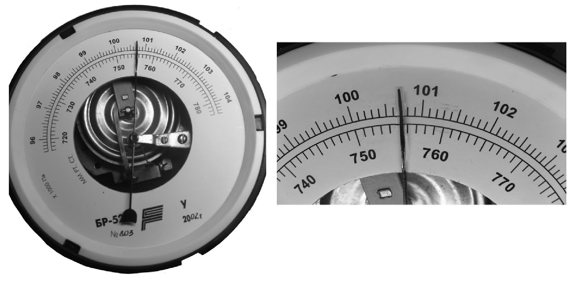 Запишите показания барометра с учётом абсолютной погрешности измерений. Верхняя шкала барометра проградуирована в кПа, нижняя — в мм рт. ст. Абсолютная погрешность прямого измерения барометра равна цене деления барометра.